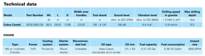 With a wide range of tools, you can use the Cobra Combi for everything from cutting and breaking to driving and compacting. The Combi offers the extra feature of drilling capability. Whether you need to just break a small patch of concrete, or split a rock, you can get the job finished with a gasoline-powered machine in the same amount of time it takes to set up a compressor and hoses.