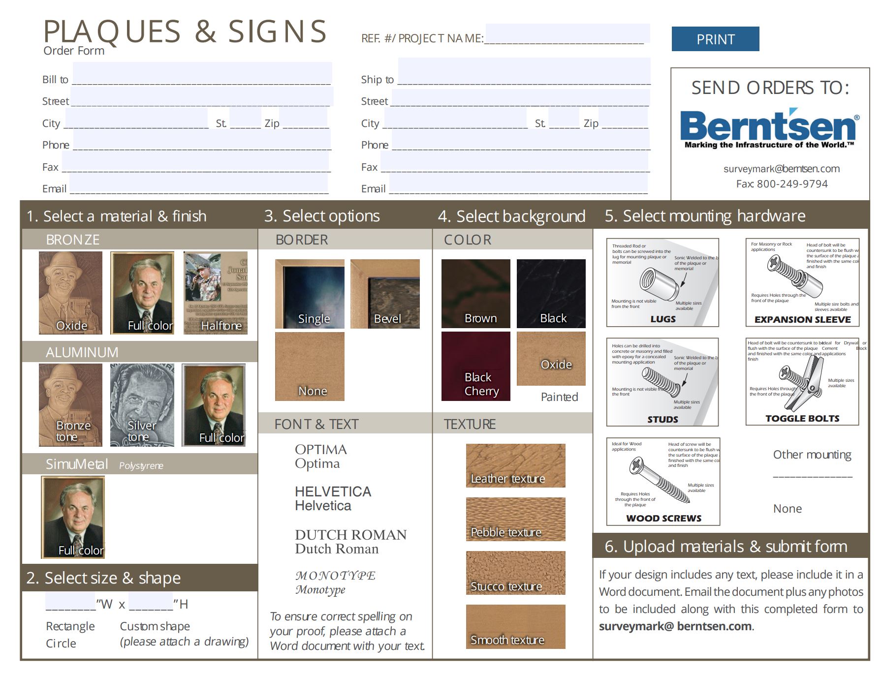 - Content: provide specific wording in a document or any pictures and submit the completed plaque order and layout form to surveymark@berntsen.com to get started.