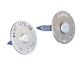 Choose from aluminum, brass or stainless steel washers to meet your requirements. All washers are available in 1½" (38mm) diameter. Brass washers are also available in 2" (50mm) diameter and fit several sizes of Magnails for asphalt. Personalized with your company name, emergency phone number or warning / caution message at no additional charge if you order 100 or more identical washers. Up to 28 characters on one row can be stamped on the 1½" washers. Two rows (outer row: 40 characters, inner row: 28 characters) can be stamped on the 2" brass washer.