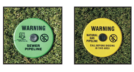 SoilMarkers go where posts won't work. They eliminate homeowners complaints of marker posts on their property. These rugged disks can be walked on, mowed over and driven on. SoilMarkers quickly locate buried drops, stub ends, valves, handholes, manholes and test stations.